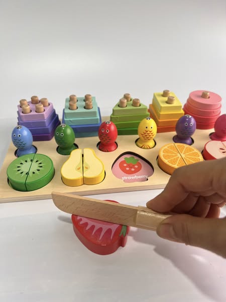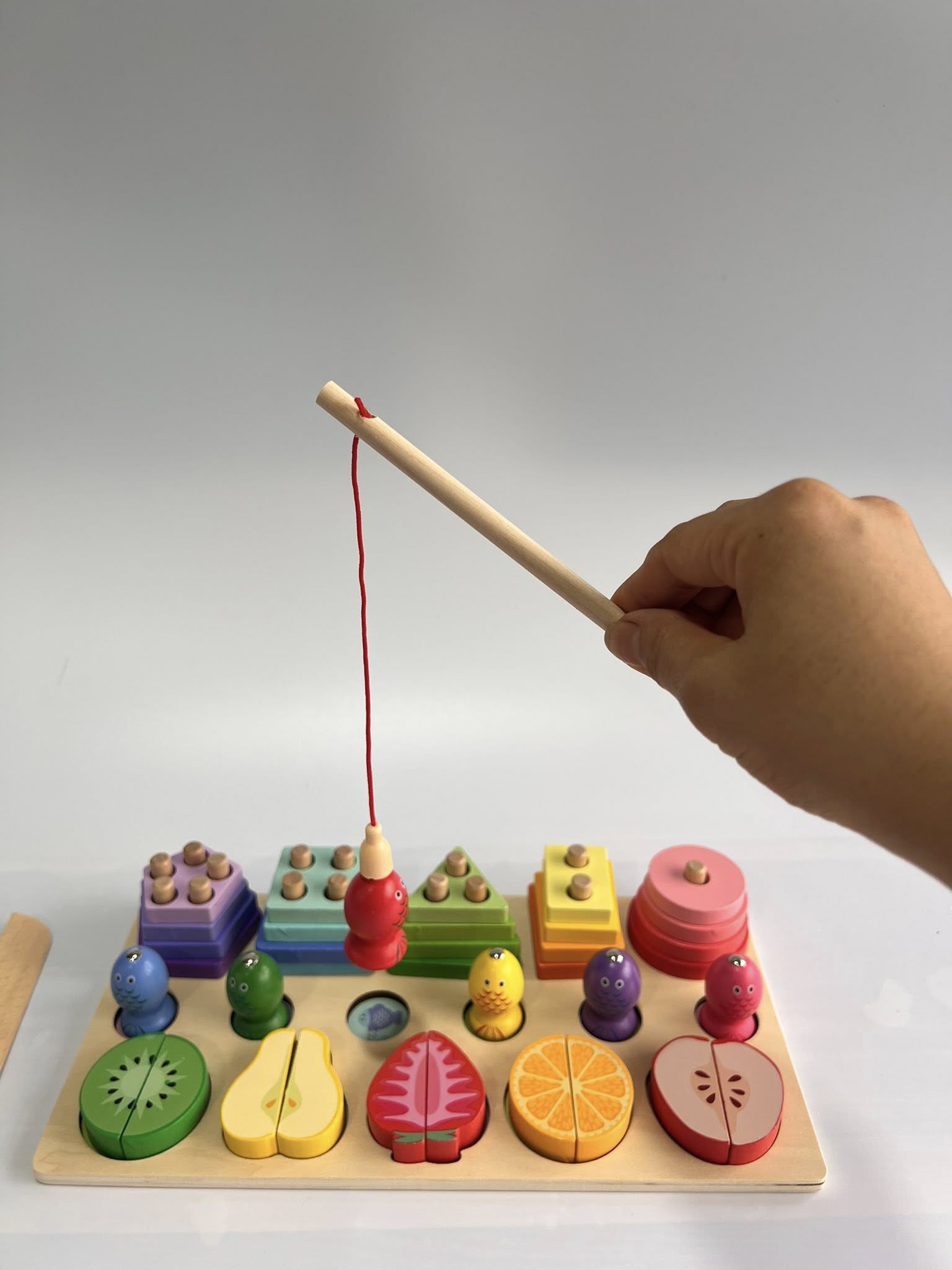 • Trọn bộ gồm: Bảng gỗ + Cần câu nam châm + Dao gỗ + Bộ khối hình + Bộ hoa quả nam châm.